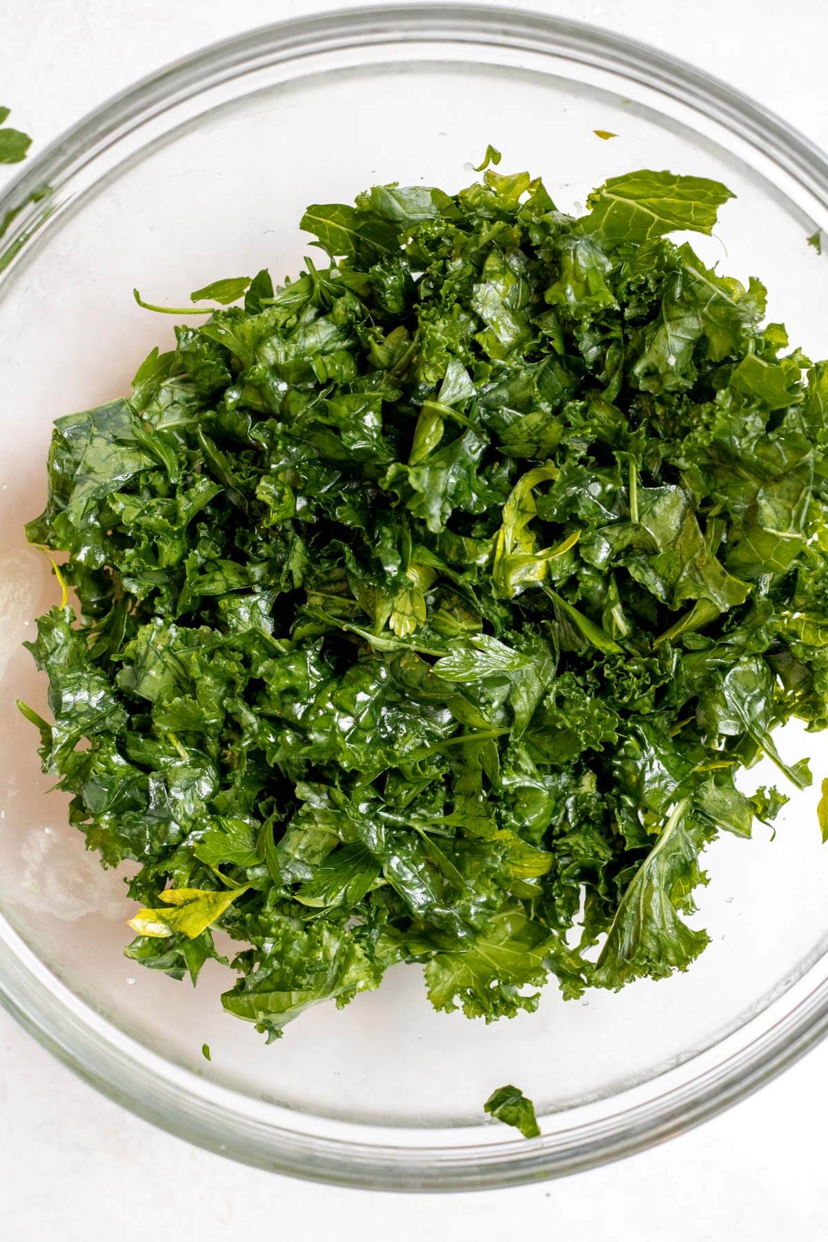- While squash is cooking prepare kale, add kale and parsley to a large bowl. Drizzle sesame oil and sea salt over kale. Using your hands massage the kale until the leaves begin to look brighter green and appear softer to the touch. This should take about 1-2 minutes.