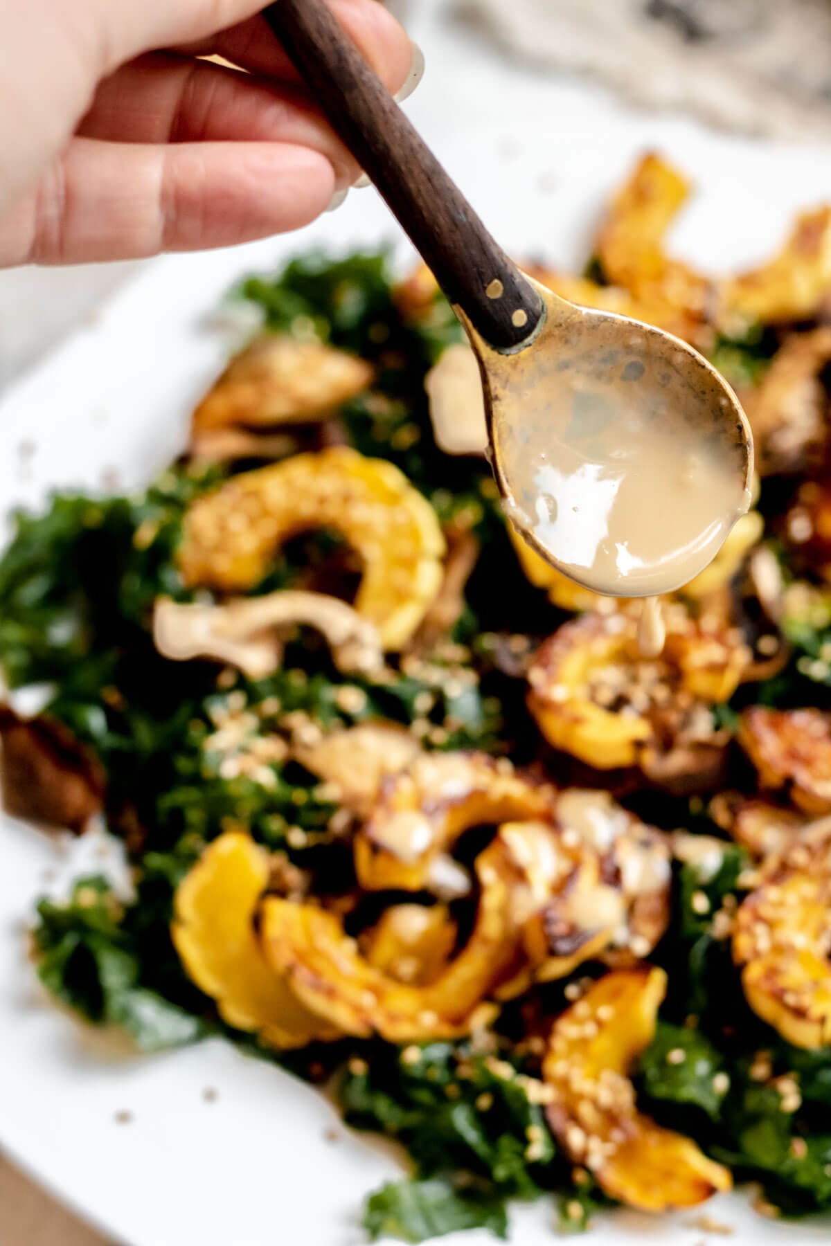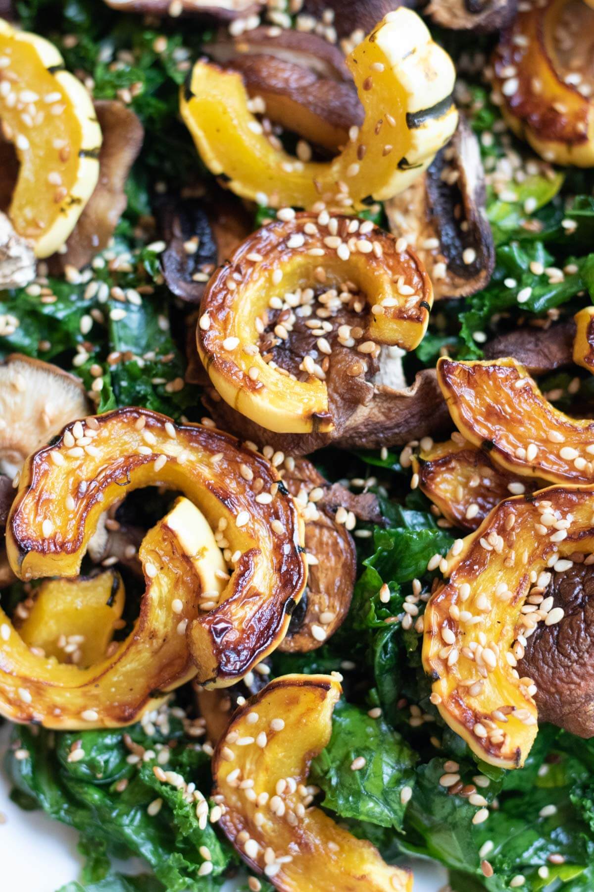 Winter salad hero! This delicata squash salad comes together in a quick 30 minutes, perfect for a hardy weeknight side dish or main dish. Warm wild mushrooms, perfectly roasted delicata squash on top of tender kale with a sesame ginger dressing that you will flip for!