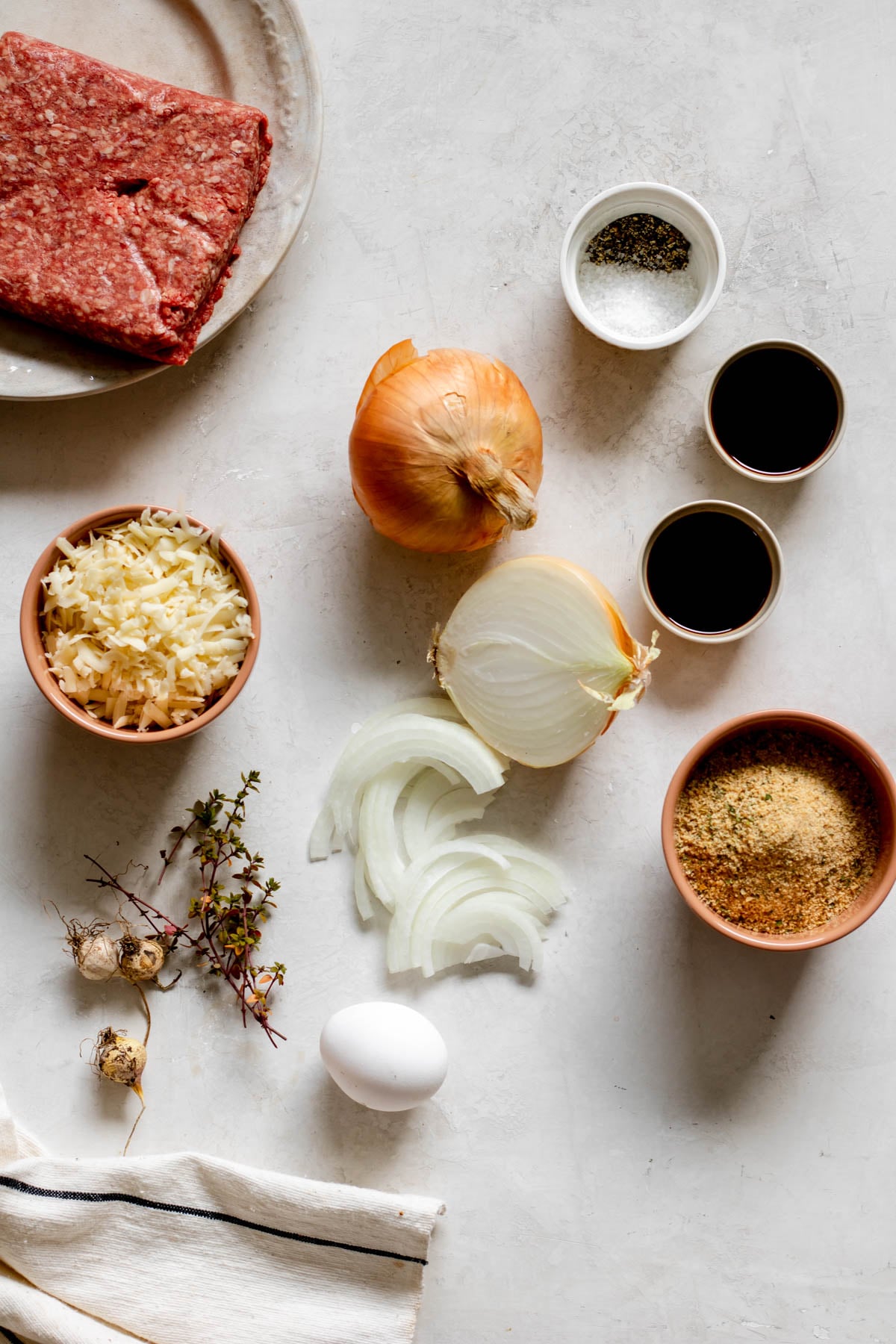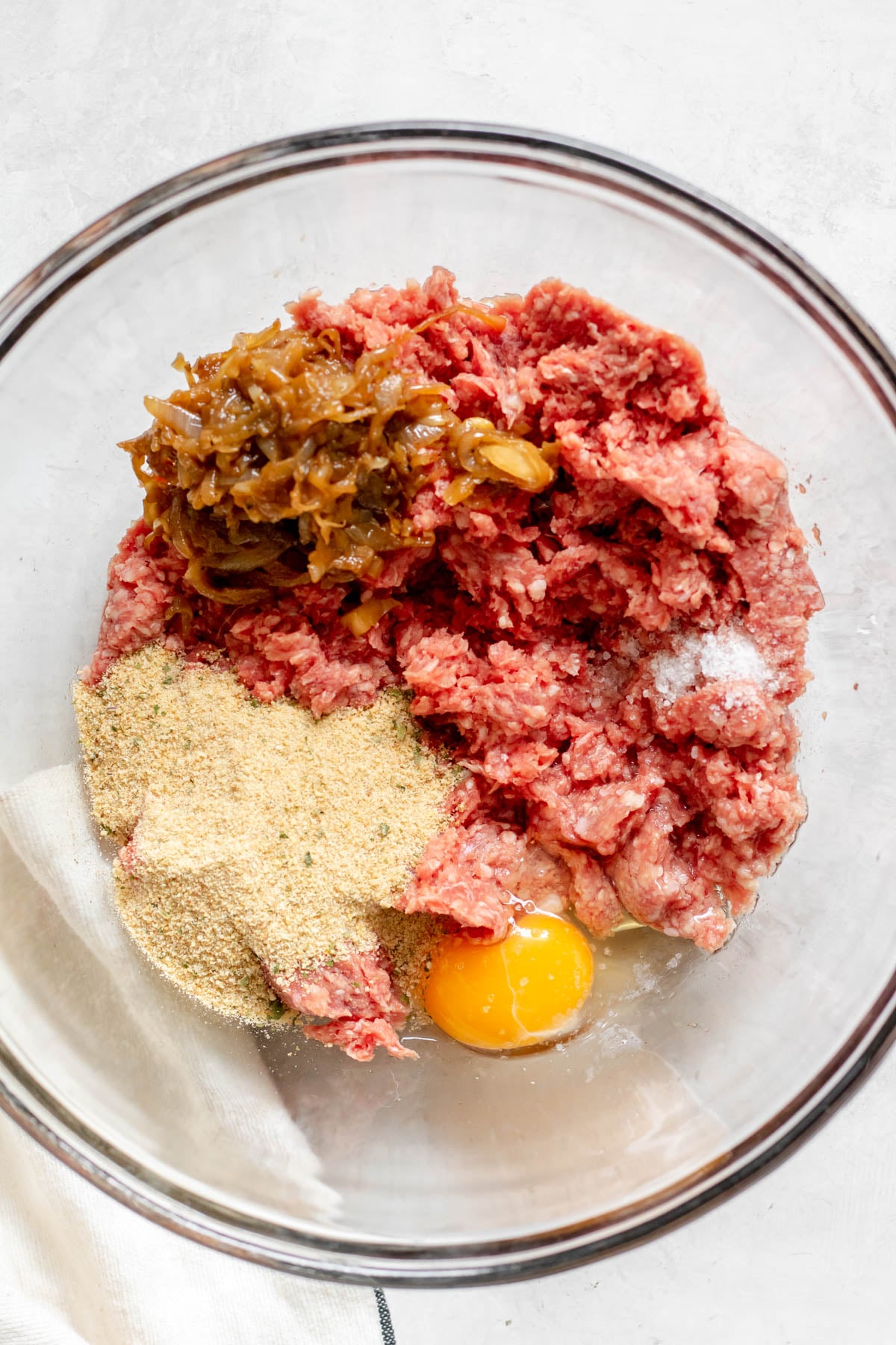 - In a large bowl, combine ground beef, egg, breadcrumbs, salt, pepper, and half of the caramelized onions. Mix gently until combined.1 lb ground beef, 1 large egg, ¼ cup breadcrumbs, 1/2 tsp black pepper, 1/2 tsp sea salt