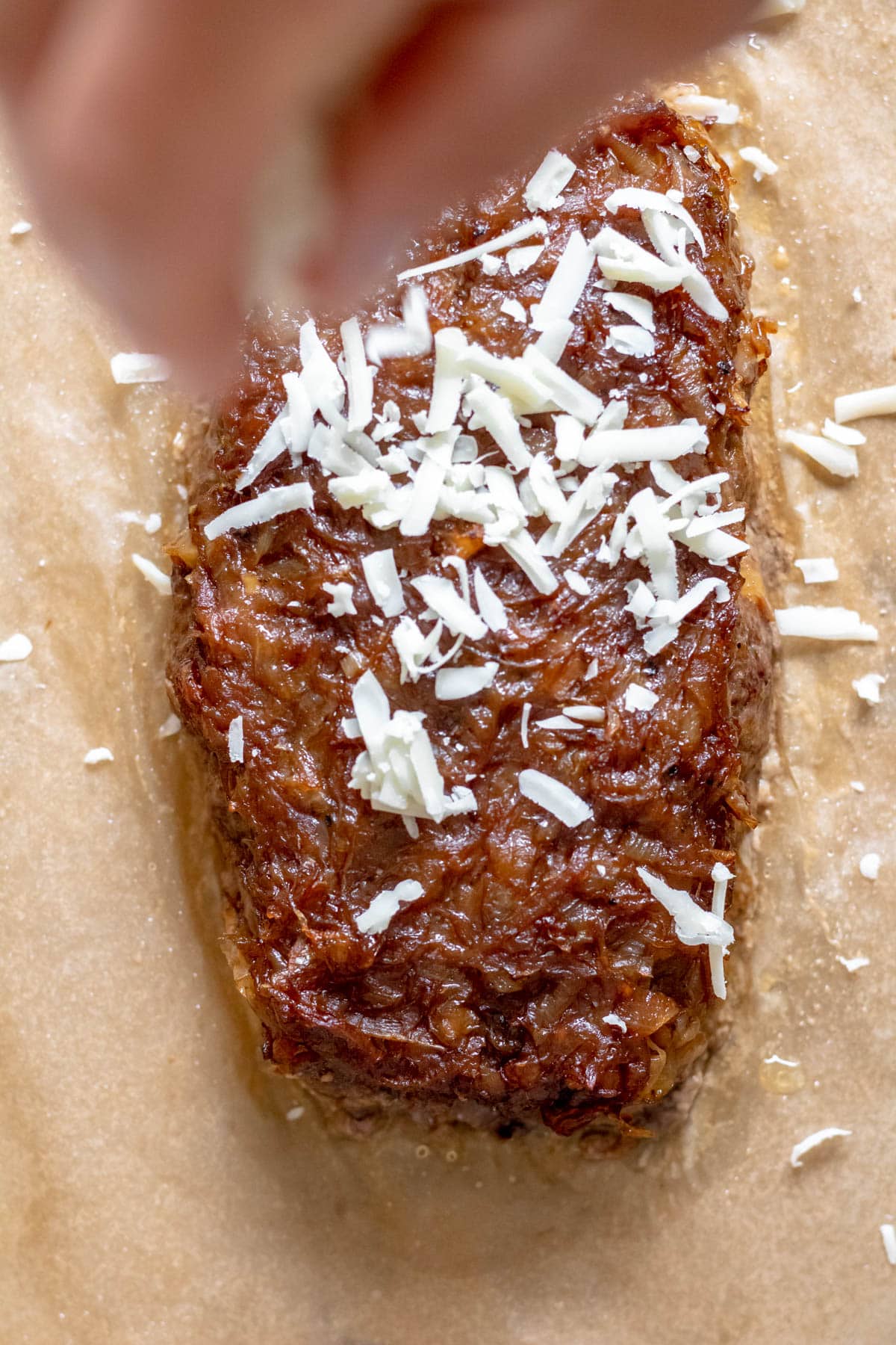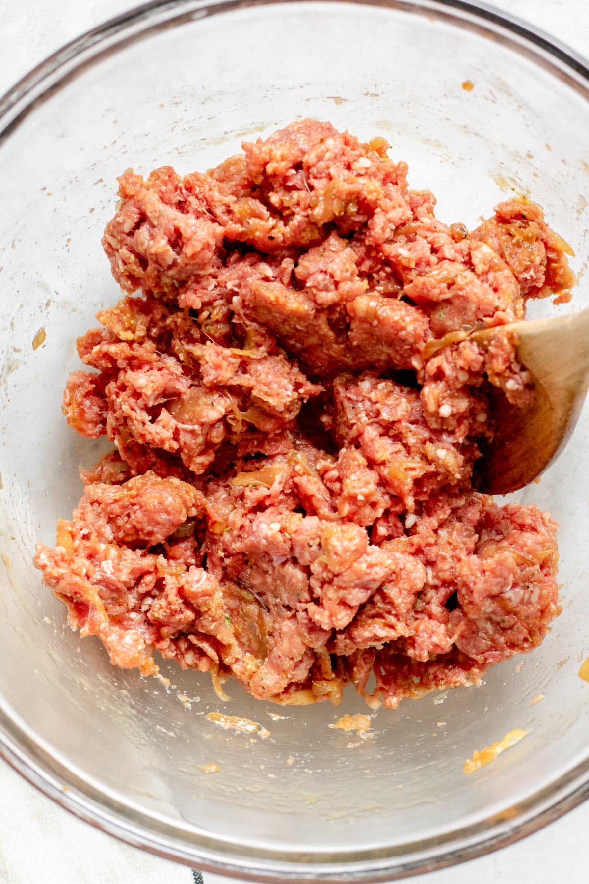 Let the caramelized onions cool to warm-room-temp before folding half into the meat mixture.