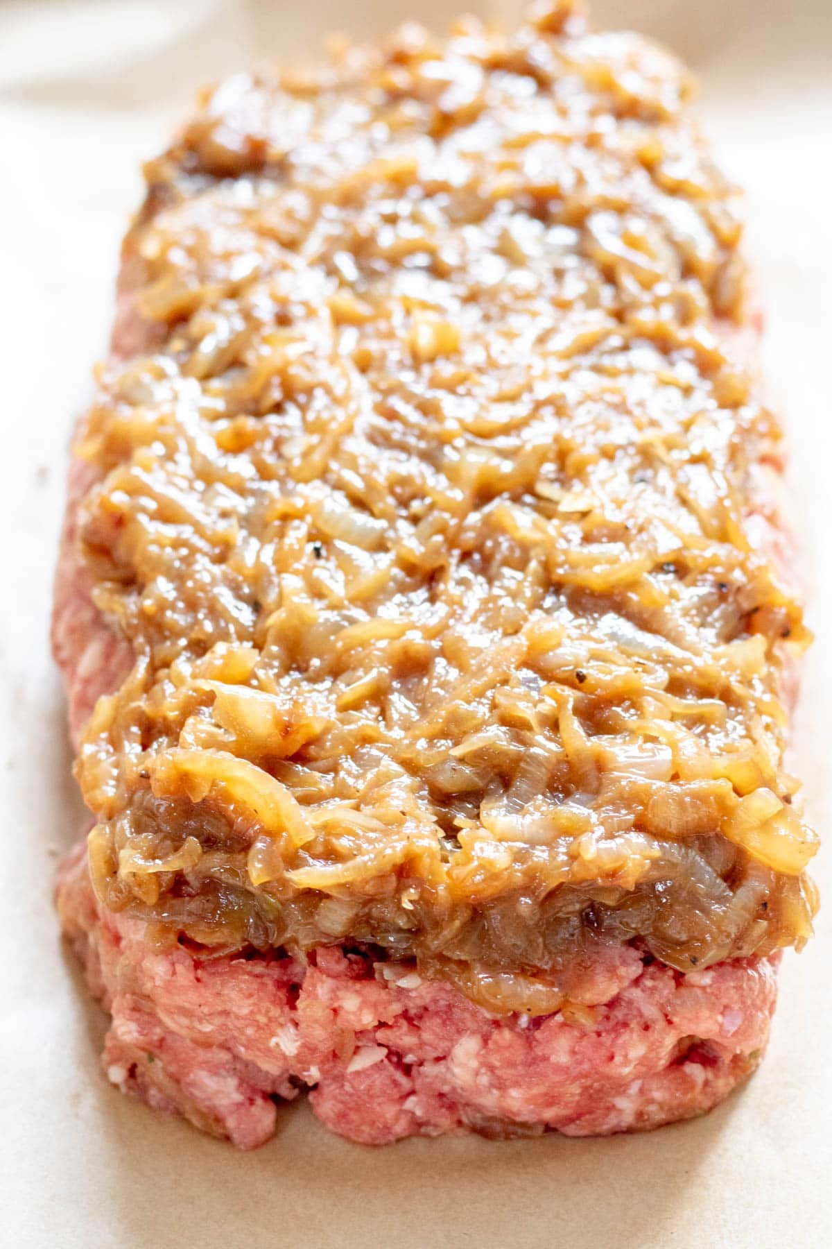 After the meatloaf bakes for 30 minutes, pull it from the oven and add a generous layer of the remaining caramelized onions.