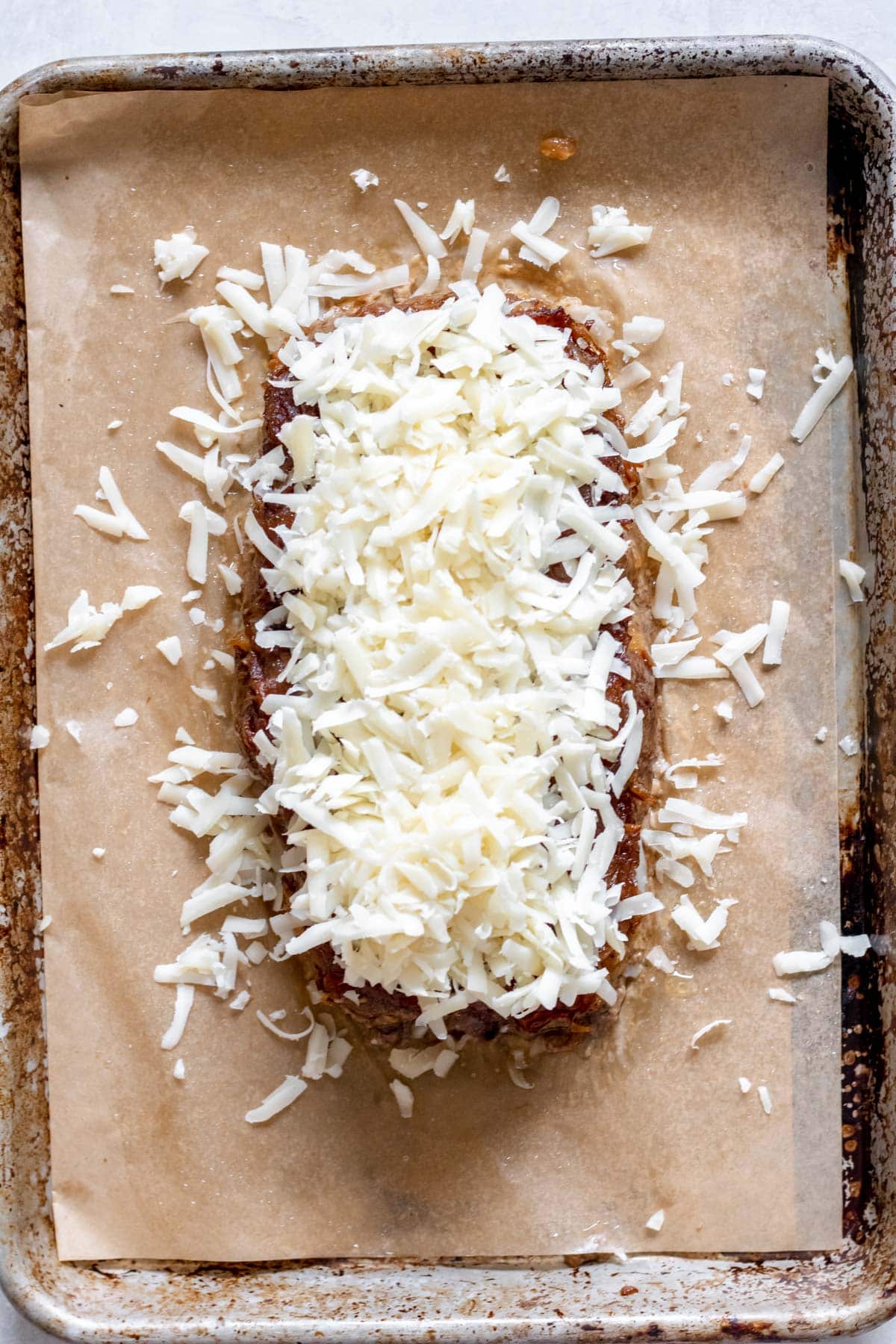 - Spoon the remaining caramelized onions over the partially baked meatloaf, then top with shredded Gruyère.1 cup Gruyère cheese