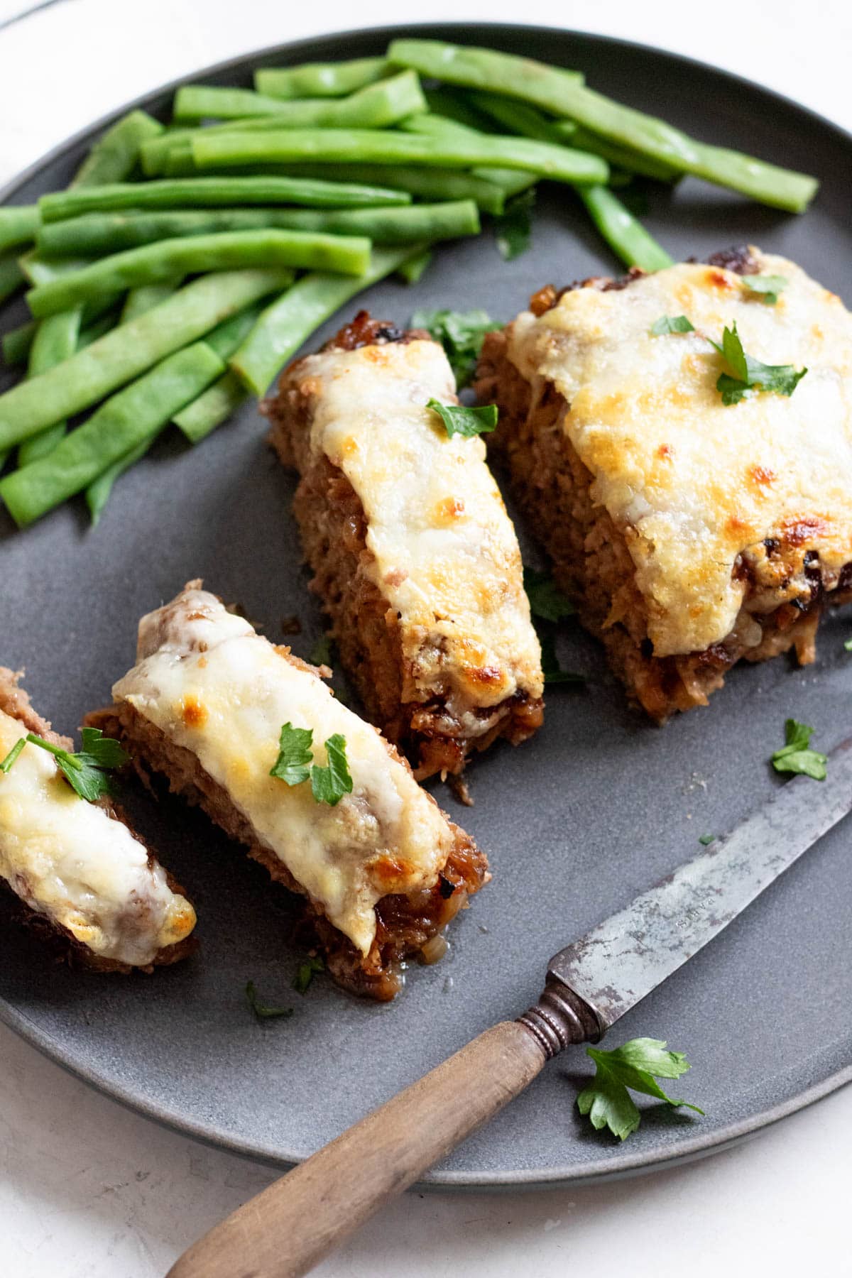 This French onion meatloaf is deeply savory, impossibly cozy, and loaded with sweet caramelized onions that take it completely over the top. There are caramelized onions folded into the meatloaf AND a lush layer piled on top with melty, broiled Gruyere—just like the crown of a perfect French onion soup.