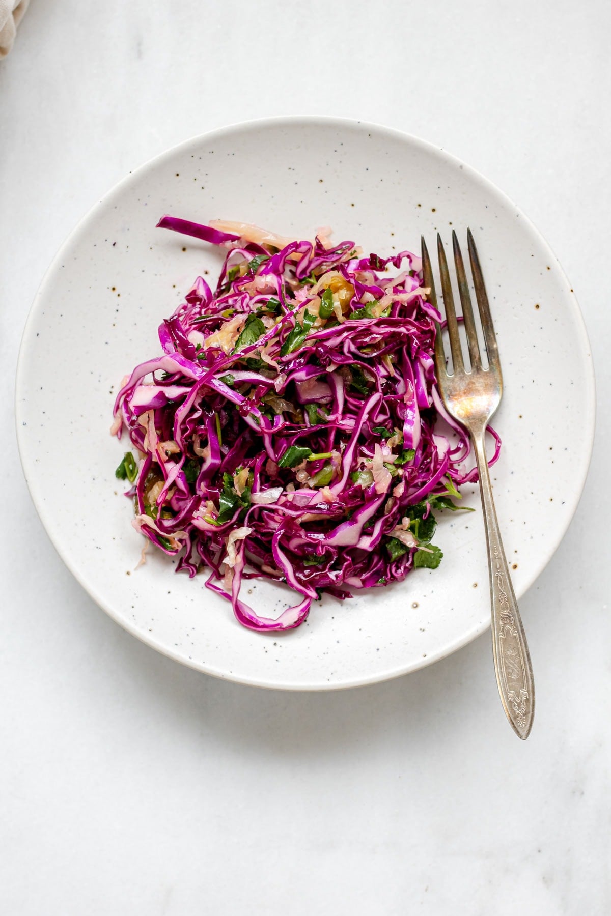 Because I am a recipe developer and a die-hard creative in the kitchen I have made no less than a dozen different types of slaw, this newest iteration may be my favorite. Briny red cabbage slaw spiked with just the right amount of sauerkraut, heat from jalapeno, zesty lime, garlic and cilantro.