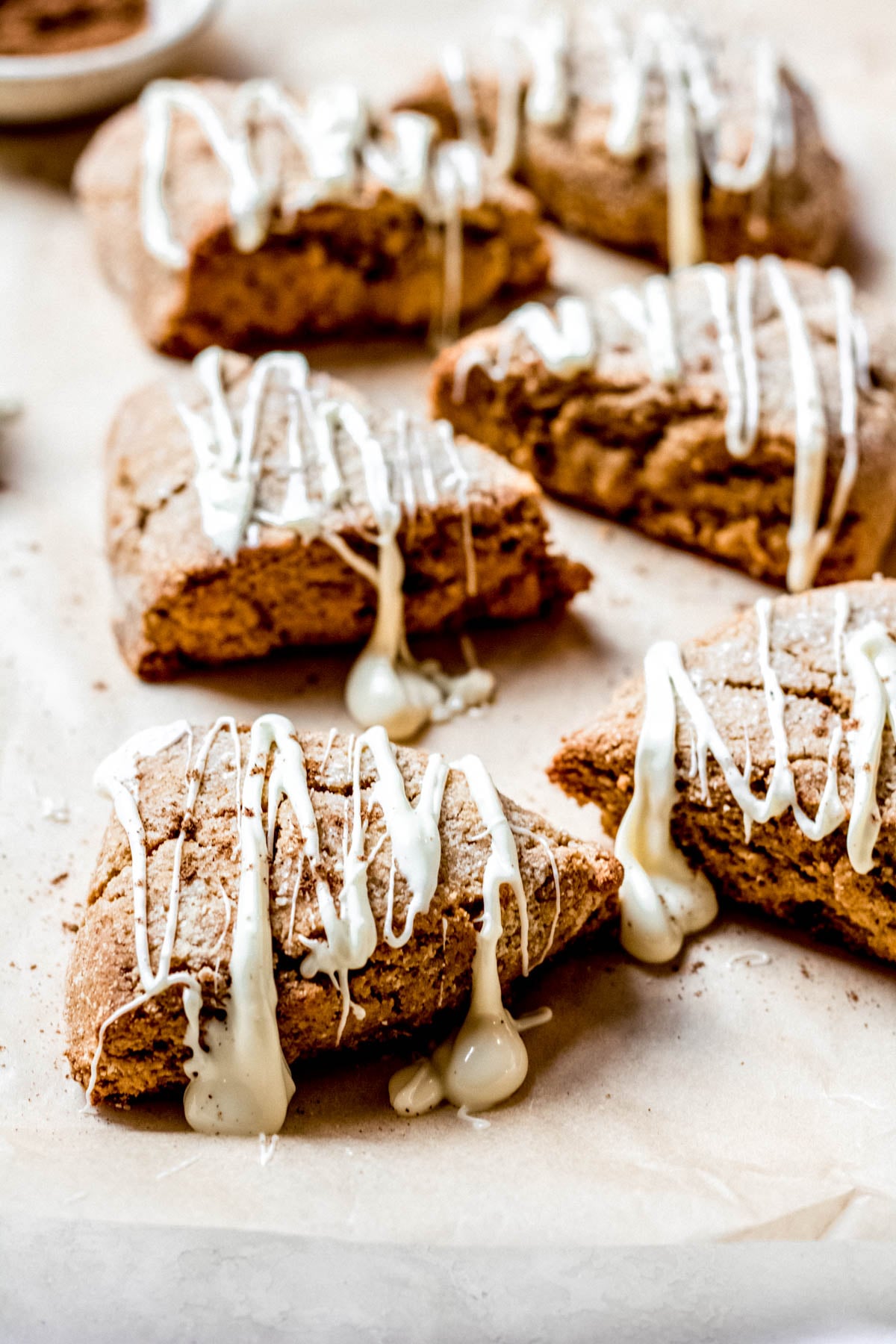 Full of the best pumpkin flavors! Pumpkin spice scones are soft and tender and drizzled with white chocolate. Gluten-free, made with almond flour.