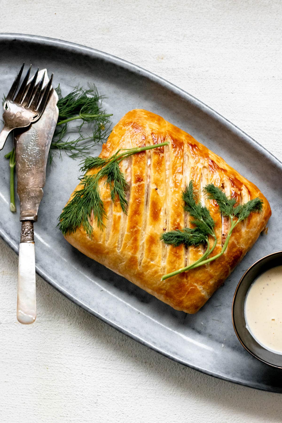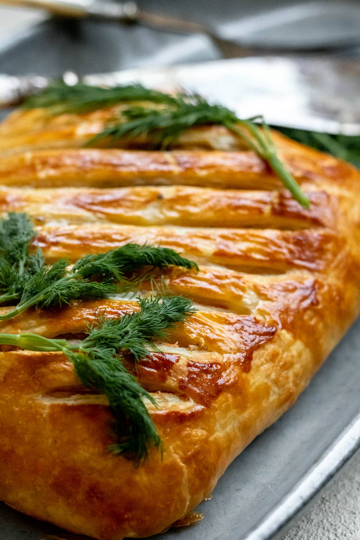 This is a dish worthy of a celebration! Salmon Wellington, also called salmon wrapped in puff pastry, is a divinely cooked salmon filet wrapped in buttery, golden brown, flaky, puff pastry, stuffed with creamy spinach, finely diced fennel, and Boursin cheese mixture, and then topped with sprigs of fennel fronds and fresh dill. It's as beautiful as it is delicious and will become a go-to recipe for dinner parties or a special evening at home.