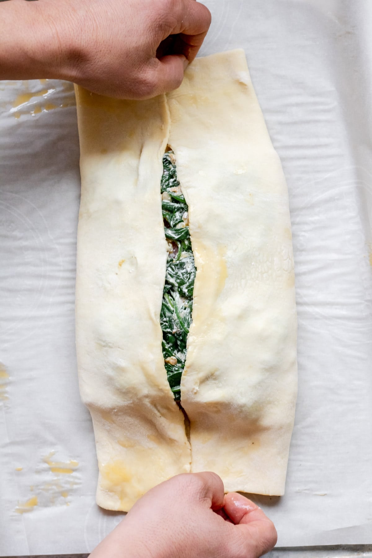 I sprinkled a couple tablespoons of panko breadcrumbs on the pastry before spreading the spinach mixture to keep the pastry from getting soggy. Also preheat pan in oven, and then lay parchment and salmon on hot pan.