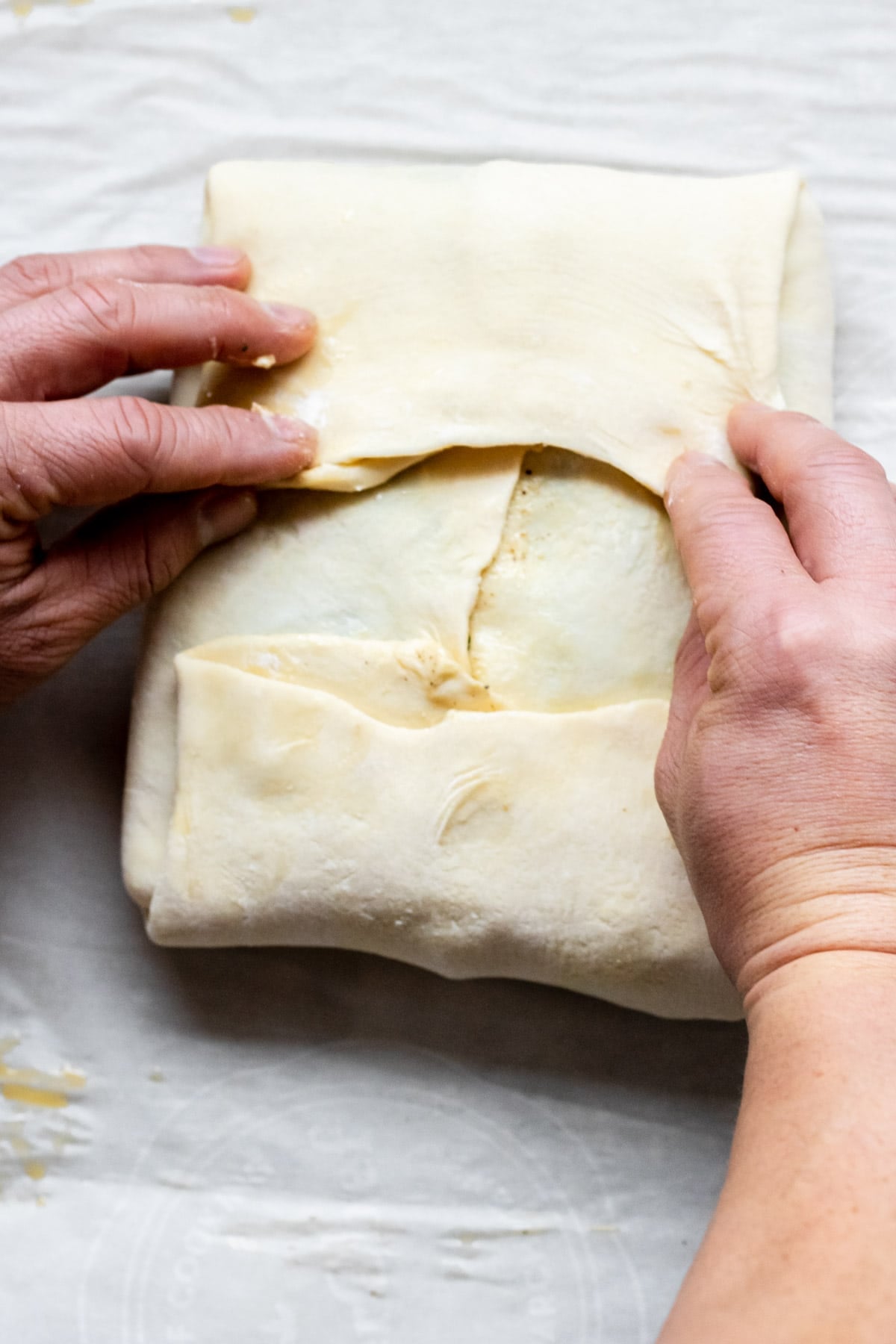 - Puff pastry – This is the outer casing that holds the rest of the ingredients together in an envelope of goodness. Golden brown and flaky, puff pastry dough locks in moisture and has a delicious light buttery flavor. You can find puff pastry in the freezer section of your local grocery store.