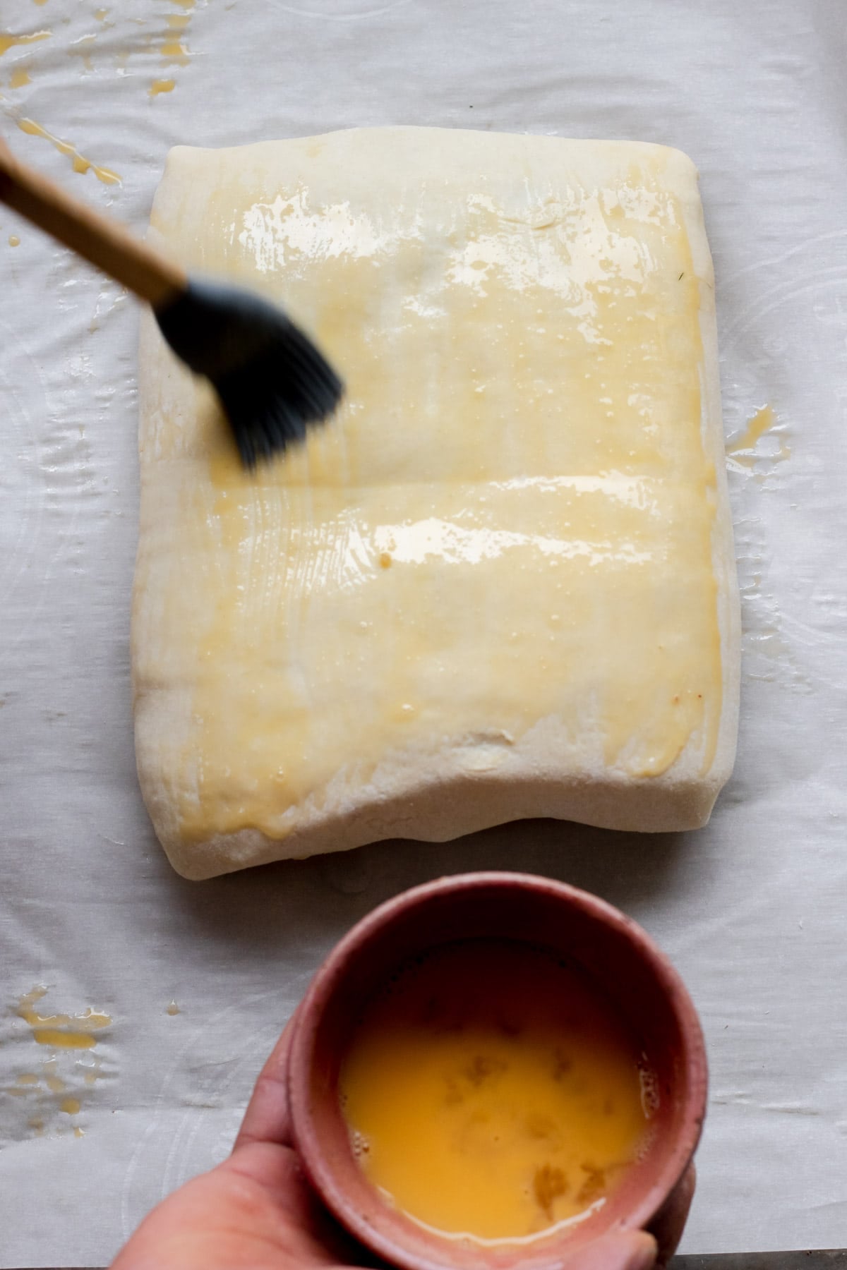 - Brush the edges of puff pastry, all the way around, with egg wash.