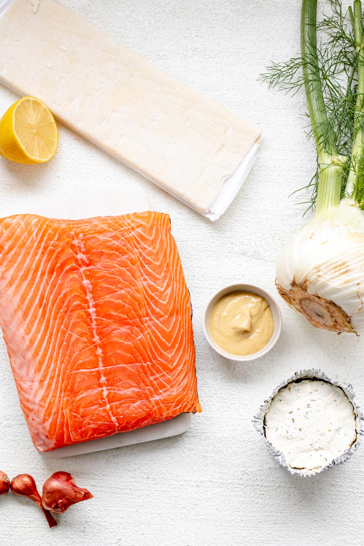 - Place salmon in the middle of puff pastry, and top with spinach fennel filling.